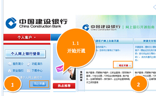 点击建行网站首页左上方个人网银登录区的“马上开通”按钮,在网上银行开通指南页面选择普通客户网上自助开通。