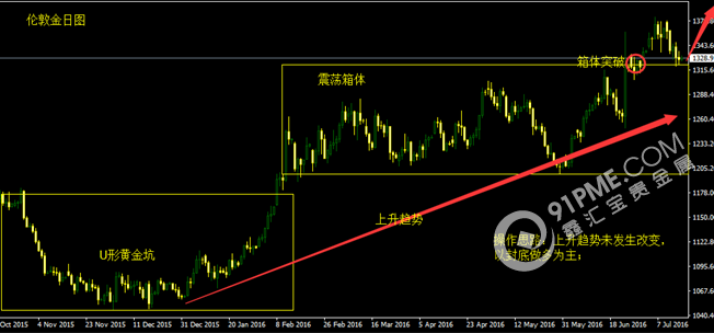 伦敦金日图技术分析,黄金走势仍然延续上升趋势,趋势未发生改变,呈多头排列。在1375位置附近多头受阻,出现短期多头回调。但中长期对黄金看多。操作上:激进者可以选择回调到1330-1320位置附近多单进场。