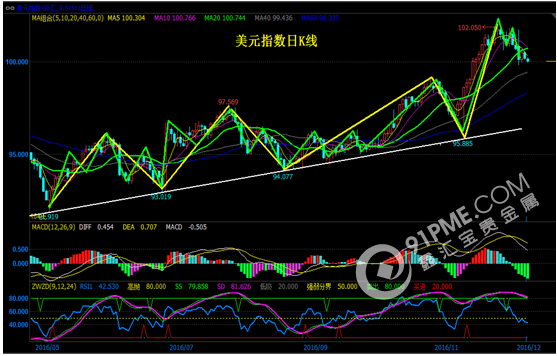 昨日(12月7日)美元指数小幅上下跌,开盘100.49,最高100.60,最低100.14,收盘100.18,跌幅0.18%,日线报收基本饱和中阴线,从指标来看MACD柱状线翻到0轴之下且有上逐渐边长迹象,DEA和DIFF双线在0轴上方有形成"水上死叉"。今日欧洲时段,需要稍加留意法国的两项数据,然后北京时间20点45分,密切关注欧洲央行的利率决议结果。目前市场广泛预期欧洲央行将会延长债券的购买时间。此后,21点30分欧洲央行行长德拉基还会召开新闻发布会,市场参与者可以从德拉基口中明确找出欧洲央行施政的前景。晚间纽约时段,主要关注美国的当周初请失业金数据。