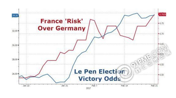 随着这位誓带领法国退欧,并将以新法郎代替欧元的“法国特朗普”支持率节节攀升,市场避险情绪也连连升温。1月22日以来,在勒庞在民调中所获支持率持续走高之际,德法债券息差也持续攀升。