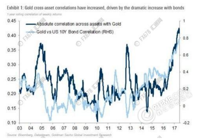 另一方面,黄金自2002年与全球债券的相关性就达到了100%(各资产间的相关性下图所示),因此黄金对加息预期的敏感度也将增加。同时,随着全球增速动能可能已经到达顶峰,黄金将成为对冲股票市场风险的选择,尤其是对低收益的外汇而言。