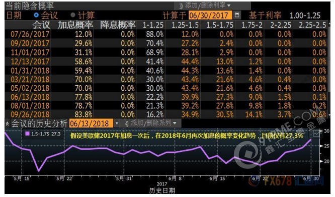 从市场的角度来看,预计美联储2017年还会加一次息早已是公开的秘密了,然后在2018年6月前再加一次息概率目前仅有27.3%。