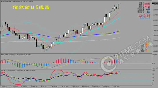国际现货黄金周四(9月8日)强势上涨,美市盘中最高上探至1349.87美元/盎司,继续刷新一年高位,金价距离1350关口仅一步之遥。美元在美国就业数据不佳之后走弱,美元指数回落至91.405,是2015年1月以来的最低点。日内公布的美国上周申请失业救济金的人数暴增至29.8万,增加6.2万人,增幅达26%,创2015年2月以来新高,远超预期24.5万人。在飓风蹂躏的德克萨斯州的申请激增。周四欧洲央行宣布维持主要再融资利率于0%水平不变,没有公布有关退出宽松货币政策的计划;欧洲央行大幅上调2017年欧元区GDP增速预期,但同时下调2018年与2019年的欧元区通胀预期。