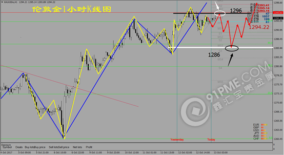 9月的会议纪要显示,美联储政策制定者对前景进行了长时间的辩论,辩论涉及通胀上升未果的情况下,如何放缓未来加息路径。由美联储发布的纪要被市场解读为温和。几位政策制定者表示,在接下来的几个月内会专注于即将到来通胀数据来决定美联储未来加息的轨迹。市场目前将焦点转移到周五即将公布的美国通胀数据,这有望给出更多的货币政策线索。如果通胀上涨超过预期或至少满足预期,将会提振美元,黄金因此会受到压制。然而,朝鲜局势危机仍然存在,地缘政治紧张局势也支撑金价,黄金有可能会再次尝试1300美元/盎司的价位。从技术上看,目前金价已接近1300关口,企稳在1290一线附近,因此,若不出大的意外,黄金冲关1300应该是指日可待。