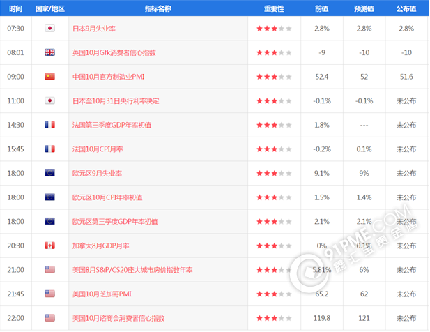 从日线图来看,MACD金叉后回落在0轴附近,KDJ金叉后快速上行,快线已经进入超卖,长期均线横盘,中期均线依然上行,短期均线横向运行,目前已经测试8月16日高点94.142附近的阻力,100日均线阻力在94.87附近。昨日(10月30日)报收一根上影线较长纺锤体中阴线,显示出一定回调迹象,今日需要关注前期高点94.267的前高位置的支撑强弱。