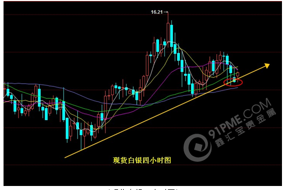现货白银价格上一个交易日走出冲高回落行情,日线收一根带上影线小阴线,价格重回震荡区域,日内关注下方20天均线支撑表现;四小时图上,白银价格冲高回落,短线面临前期低点连线支撑,后市若有效跌破,则会回落至前期低点附近寻求支撑,操作上激进者可持震荡思路为主,在重要支撑位和压力位进行短线轻仓高抛低吸操作,严格设好止损。