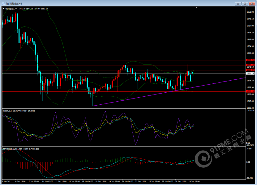 周线上看,下方60周期均线依然提供长期上涨的趋势支撑,而近期震荡向下调整,短周期均线失守后缓慢下压,限制金价的上行,指标KDJ和MACD自高位向下运行,这些迹象或表明金价短线依旧面临进一步调整的压力。日线上看,近期短线连续冲高回落,短线行情表现为震荡格局,上方压力较强,不过相对性低位存在较大的买盘支撑。4小时图上看,布林带开口略呈扩张之势,中轨隐隐向上,说明短期多头略带一定的优势。短线操作上建议高抛低吸,适当侧重低多的策略。