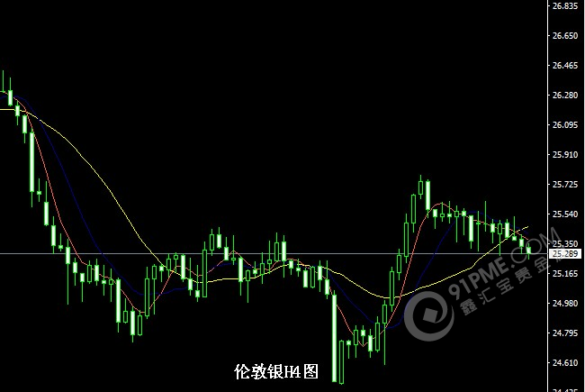 上一个交易日伦敦银价格转向震荡整理,最高至25.63美元,最低至25.27美元,收于25.39美元,跌幅0.24%,日线收一根小阴线,反弹受到20日均线一线压力,后市或延续宽幅震荡;四小时图上,伦敦银价格冲高受压后,震荡回落整理,波动幅度减少,短线或延续震荡走势,操作上激进者可在价格回落到下方支撑位轻仓做多,严格设好止损。