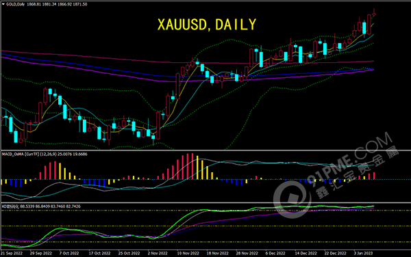 日线级别:单边上涨;MACD金叉,KDJ金叉,短期均线多头排列,目前正策略近半个月高点1878.65附近阻力,若能站稳在该位置上方,后市则有望进一步试探1900关口附近阻力,甚至是涨向1920关口附近,4月29日高点阻力也在该位置附近。下方初步支撑在1月4日高点1865.04附近,5日均线支撑在1854.00附近,较强的支撑在12月27日高点1833.18附近,10日均线支撑也在该位置附近,若意外回落至该位置下方,则削弱后市看涨信号。