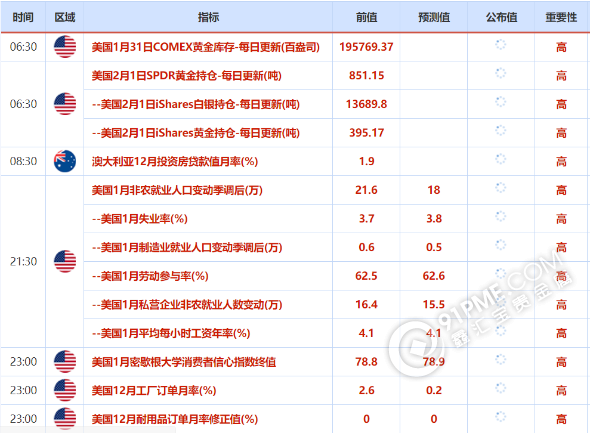 黄金市场关注焦点转移至周五的非农就业数据上,交易员希望从中寻找美联储政策路径的更多线索。北京时间周五21:30,投资者将迎来美国1月非农就业报告。权威媒体调查显示,美国1月季调后非农就业人口料增加18万,此前12月为增加21.6万。美国1月失业率料小幅攀升至3.8%,前值为3.7%。投资者也将关注薪资和劳动力参与率数据。调查显示,美国1月平均每小时工资月率料上升0.3%,年率料攀升4.1%。美国1月劳动力参与率预计为62.6%。美联储浇冷了在春季降息的想法,但表示相信通胀率会朝着2%的理想区间发展;美联储也舍弃了长期以来称可能进一步加息的措辞。