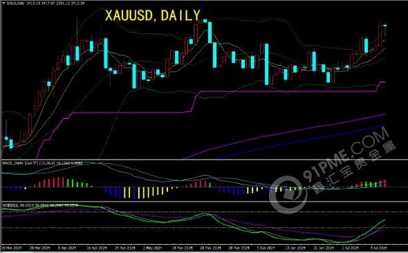 技术面来看,金价顶破了2400关口,布林线开口,MACD金叉信号延续,KDJ向上发散,短线看涨信号有所增强,后市偏向上调历史高点2450关口附近阻力,下方2400关口已经转化为初步支撑所在,7月5日高点2392.82是进一步支撑所在,若意外回落至该位置下方,则削弱后市看涨信号。