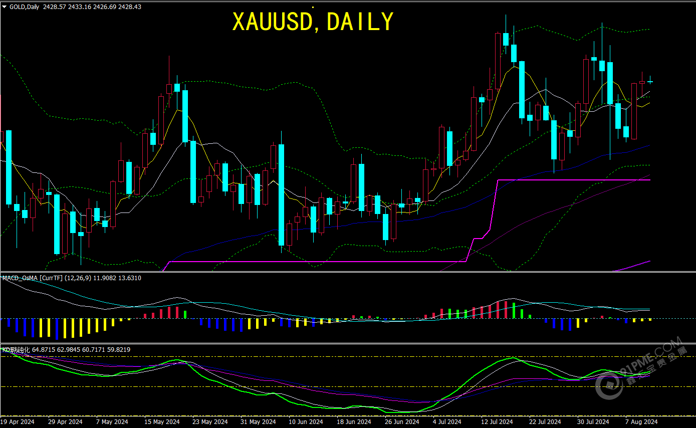 周一(8月12日)亚市早盘,现货黄金窄幅震荡,目前交投于2430美元/盎司附近。金价上周四大幅上涨后在上周五持稳,收报2430.92美元/盎司,投资者对美联储将在9月降息的信心增强,美债收益率上周五下跌,给金价提供了一些支撑,市场还将关注本周将出炉的美国CPI数据。另外,中东地缘局势依然紧张,也给金价提供避险支撑。
