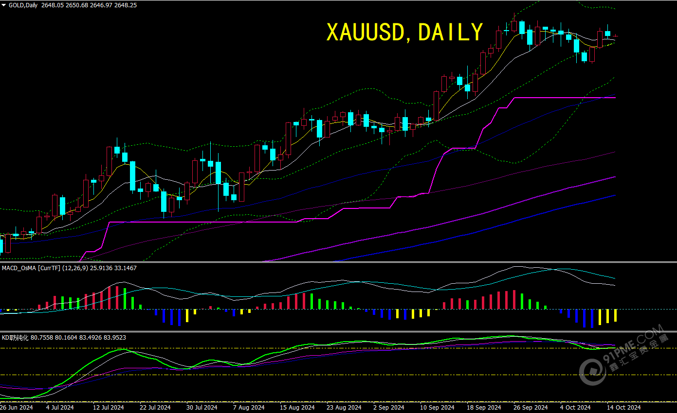 技术层面,周线级别图上,连续2周报收十字K形态,而且都是下方留有偏长的下影线。在技术指标MA均线方面,本周回撤刺穿MA5日均线后,收盘在均线之上,说明回调的需求在衰减,同样作为多头中的修正来看,没有延续性大阴和连阴走低,回撤的空间也不大,那么后面延续多头优势继续上行的动能也就有可能加大。其次,在日线方面,前期MA5日和10日均线形成死叉,日线也连续多个交易日转阴下跌,但是整体回撤的力度并不大,在9月19日拉升以后的幅度来看,回撤不到黄金分割线的61.8%的位置约2605一线,而且一直保持在2600上方,再加上在周四多次支撑2605附近不破,形态显示偏强运行,多头优势有可能将会延续。