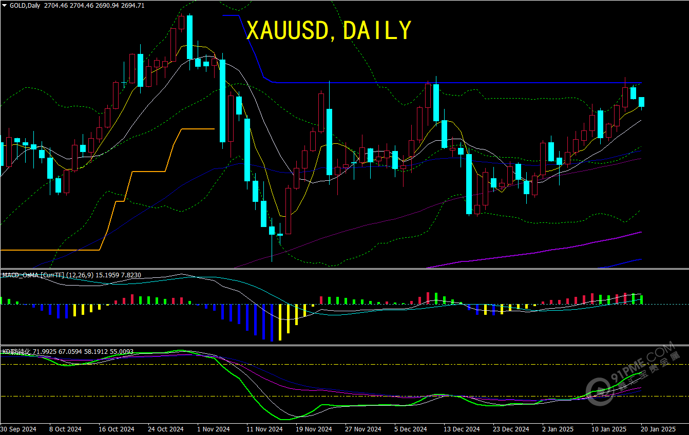 周一(1月20日)亚市,现货黄金小幅低开,受到美元上扬的打压,美国房市数据和工业产出数据强于市场预期,帮助美债收益率触及近两周低位后反弹,美元指数也企稳反弹,金价远离上周四触及逾一个月高位,但金价周线仍上涨0.5%,收报2702.35美元/盎司,美国新任总统特朗普政策的不确定性以及对进一步降息的押注重燃,帮助金价周线三连阳。周一将迎来特朗普就职典礼,特朗普可能会公布一系列新政,投资者需要予以重点关注。
