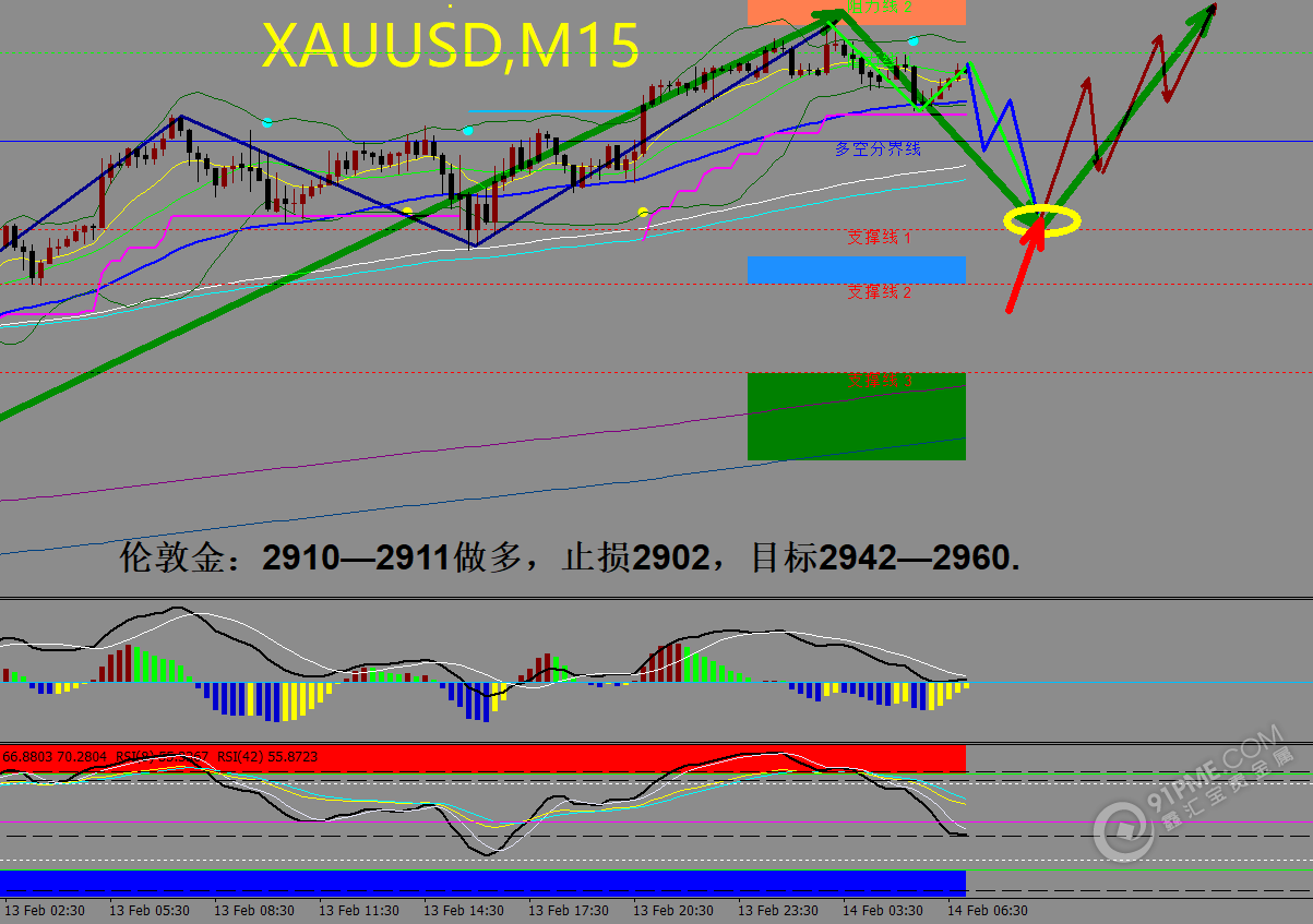 (1)关注2910—2911做多,止损2902,目标2942—2960。