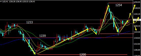 伦敦金5日均线和10日均线相互纠缠,近期整理走势较为明显,昨日试探向上突破整理区间上边缘线1250,最后以回落至1224收场,多空在此激烈交战,进一步观察其上下边缘突破情况,以判断未来运行方向。MACD双线缩口运行,红柱缩短,中期方向不明。从1小时走势图看,伦敦金下行至1220附近后起涨,一路上行至1254附近,随后承压下行,回落至1220附近,哪里跌倒哪里爬起,今早从1220再次发力上冲,目前以运行至1238附近。鑫汇宝分析,在区间1220-1250区间内高抛低吸为宜。